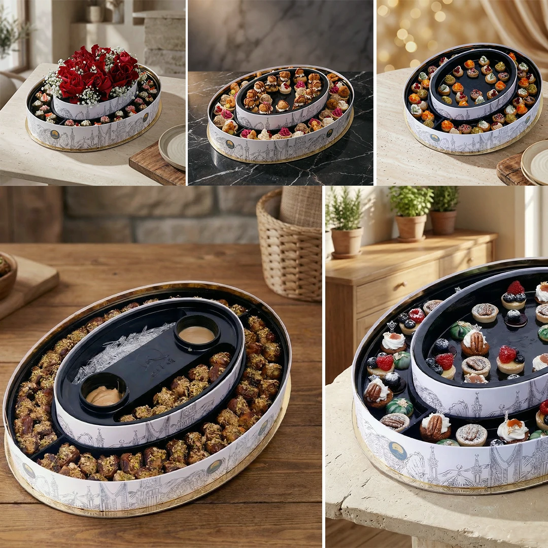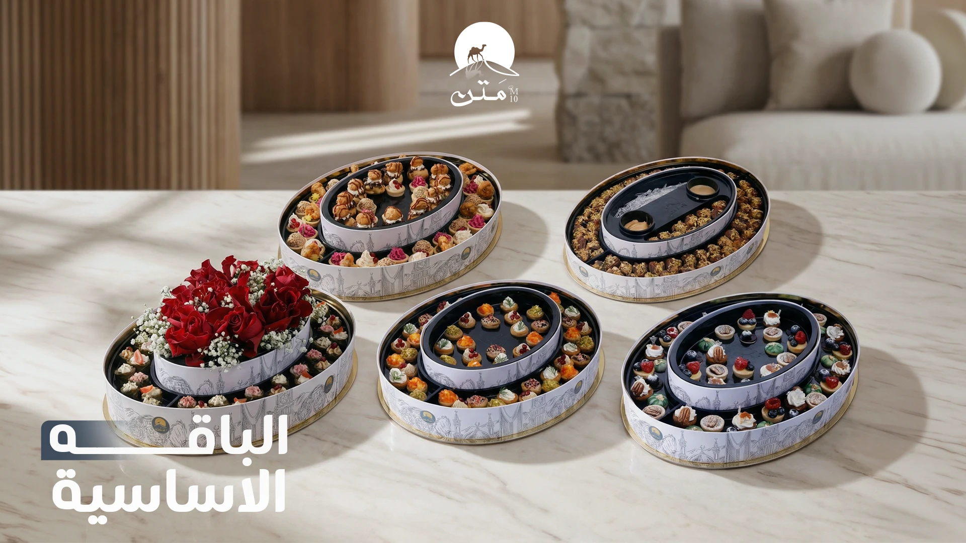 باقة مَتن الفاخرة للضيافة –5 صينية متنوعة من المعجنات، الكبة، الحلويات الفاخرة، التمر