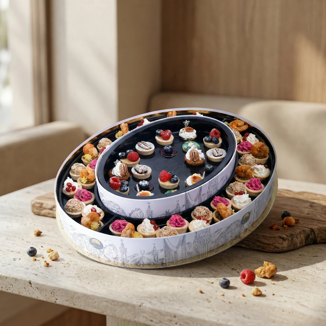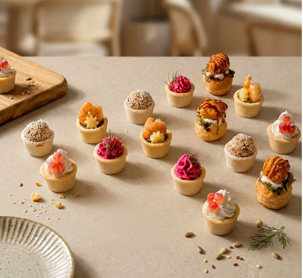 صينية راقية من المعجنات الفرنسية الميني، محضّرة بنكهات مبتكرة تجمع بين القوام الهش والحشوات الغنية، مثالية للضيافة الأنيقة والمناسبات الخاصة.